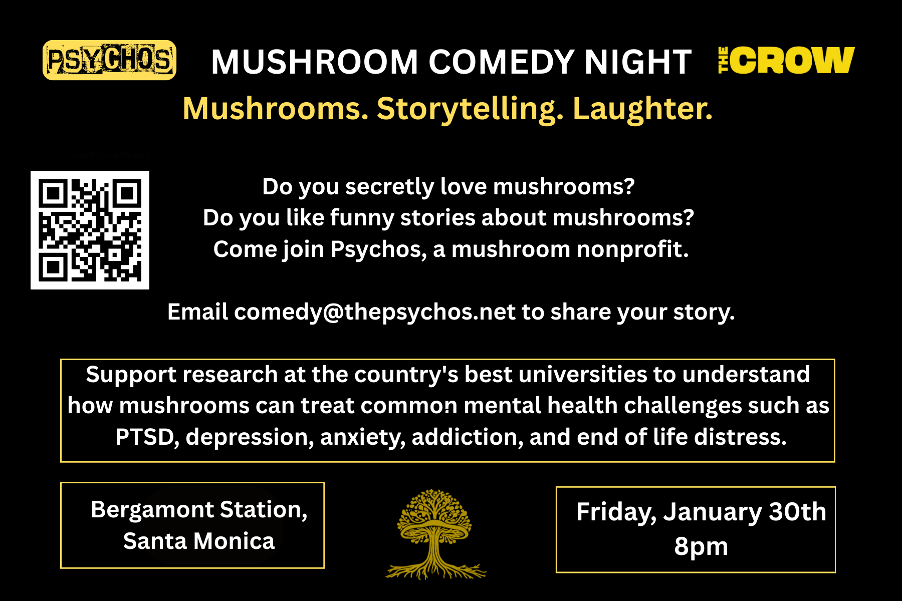 Psychos is a mushroom research 501(c)(3), and we are hosting a comedy benefit in Santa Monica on January 30th. The theme is mushrooms and it will be fun.